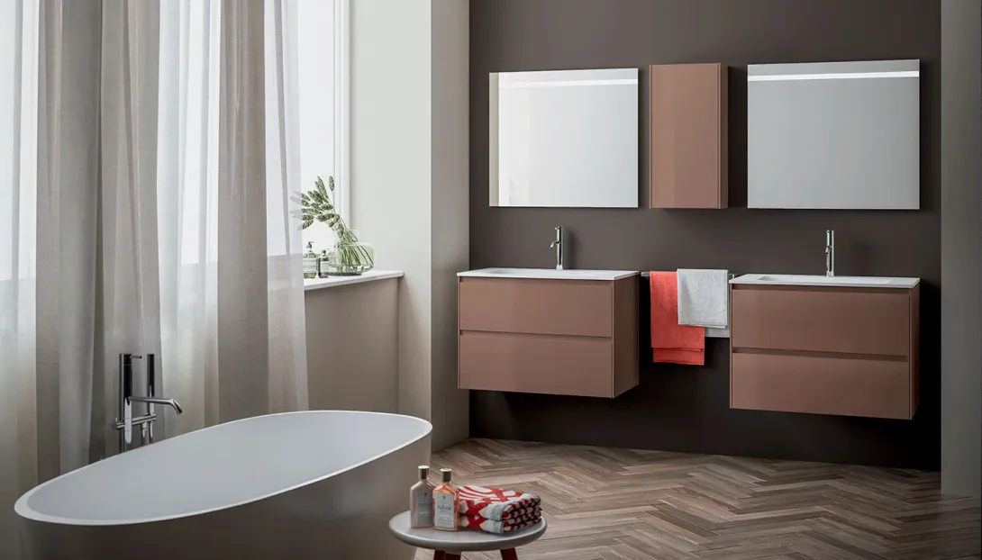 Ein schlankes Seitenprofil zeichnet eine feine Kontur entlang des Schranks und verleiht der Kollektion ihre unverwechselbare Signatur. In Kombination mit hohen Waschtischen oder Waschtischplatten aus Keramik, Ceramilux oder Mineralmarmo entsteht ein stimmiges Gesamtbild mit hohem funktionalem Anspruch.