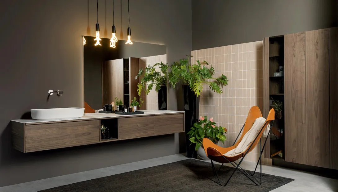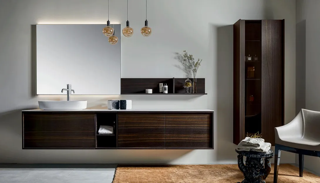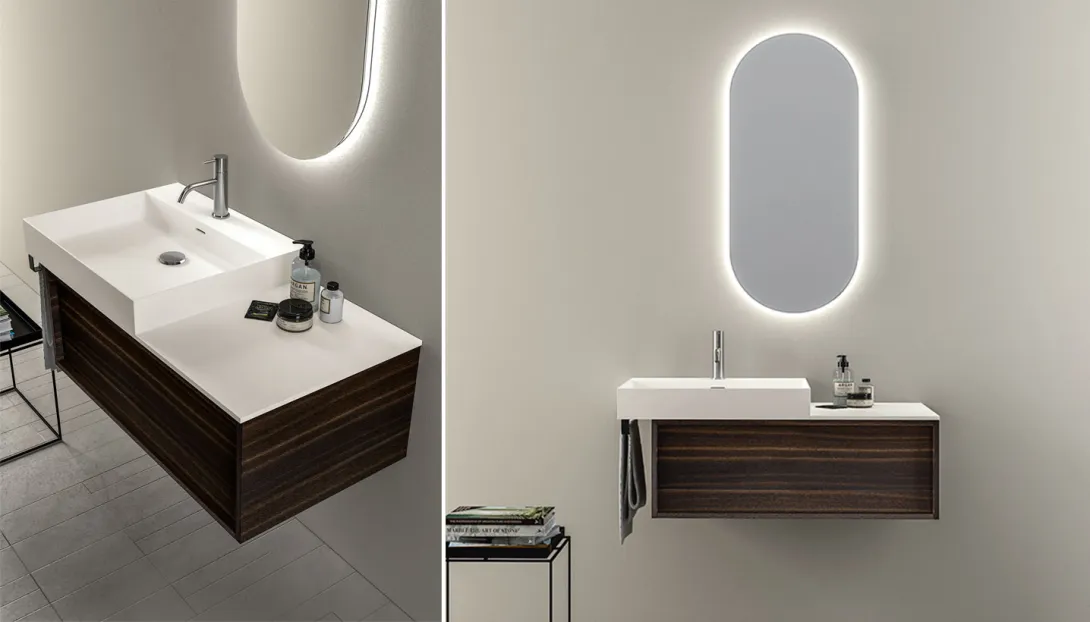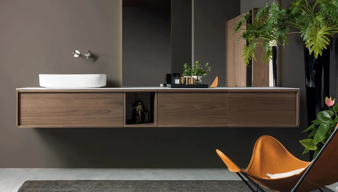 Detailansicht eines schwebenden Holzwaschtischs mit dunkler Platte und Aufsatzbecken von Stocco.