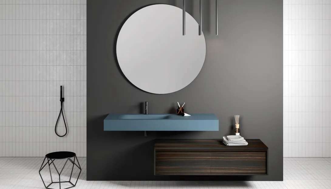 Langer, freischwebender Waschtisch aus dunklem Holz mit rundem Spiegel und minimalistischer Armatur in modernem Badezimmer von Stocco.